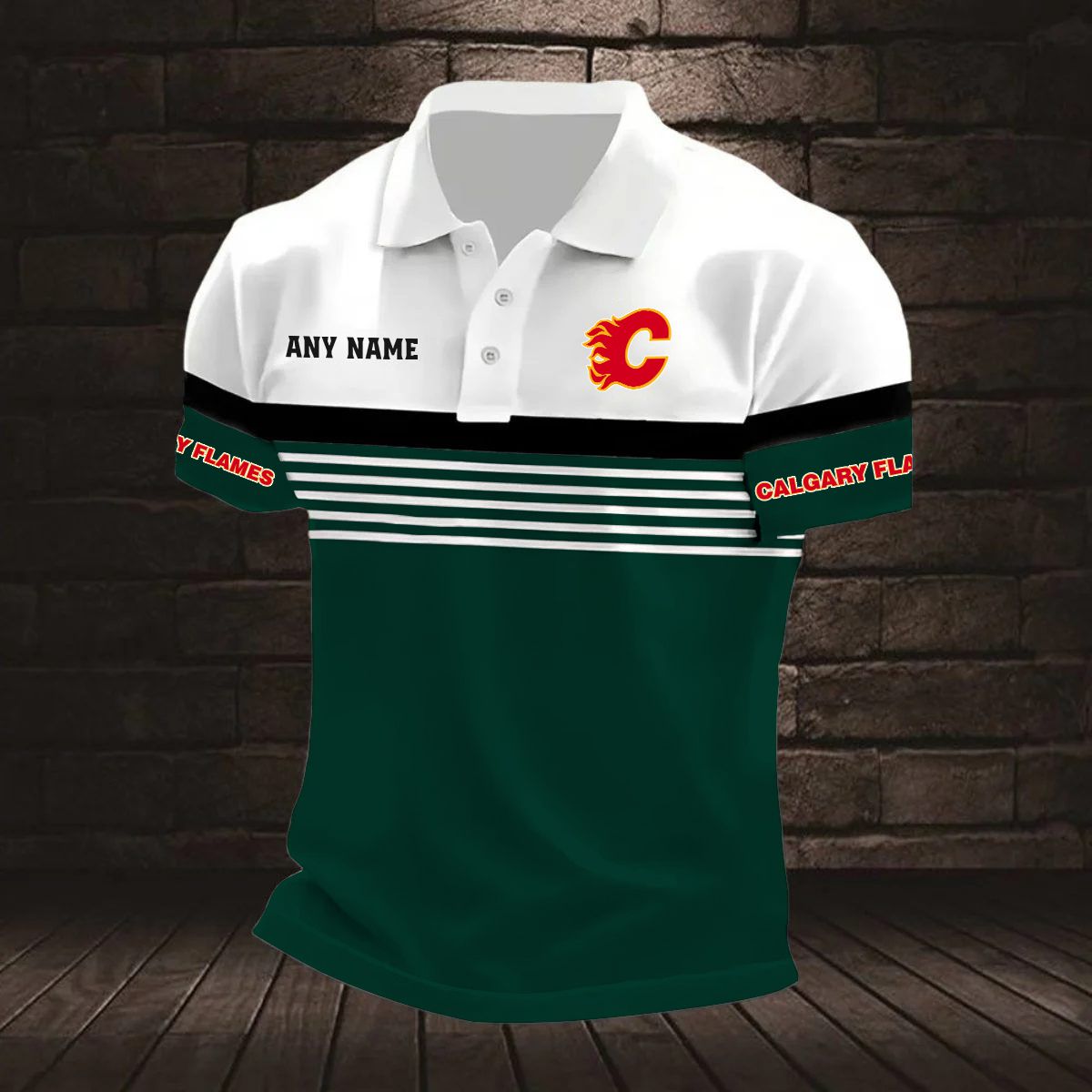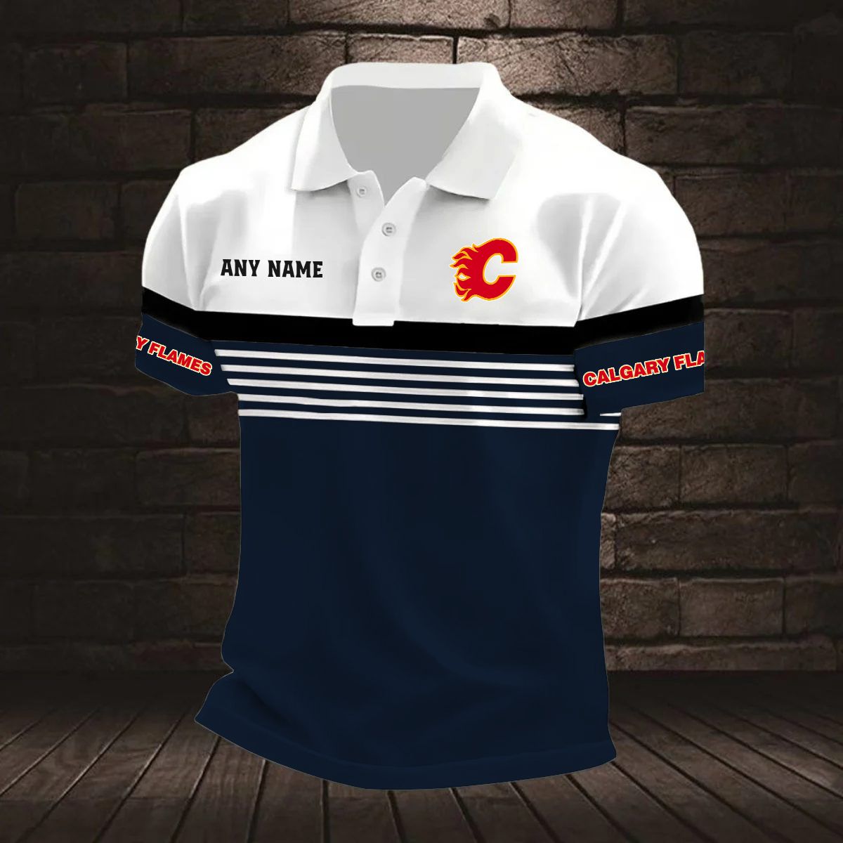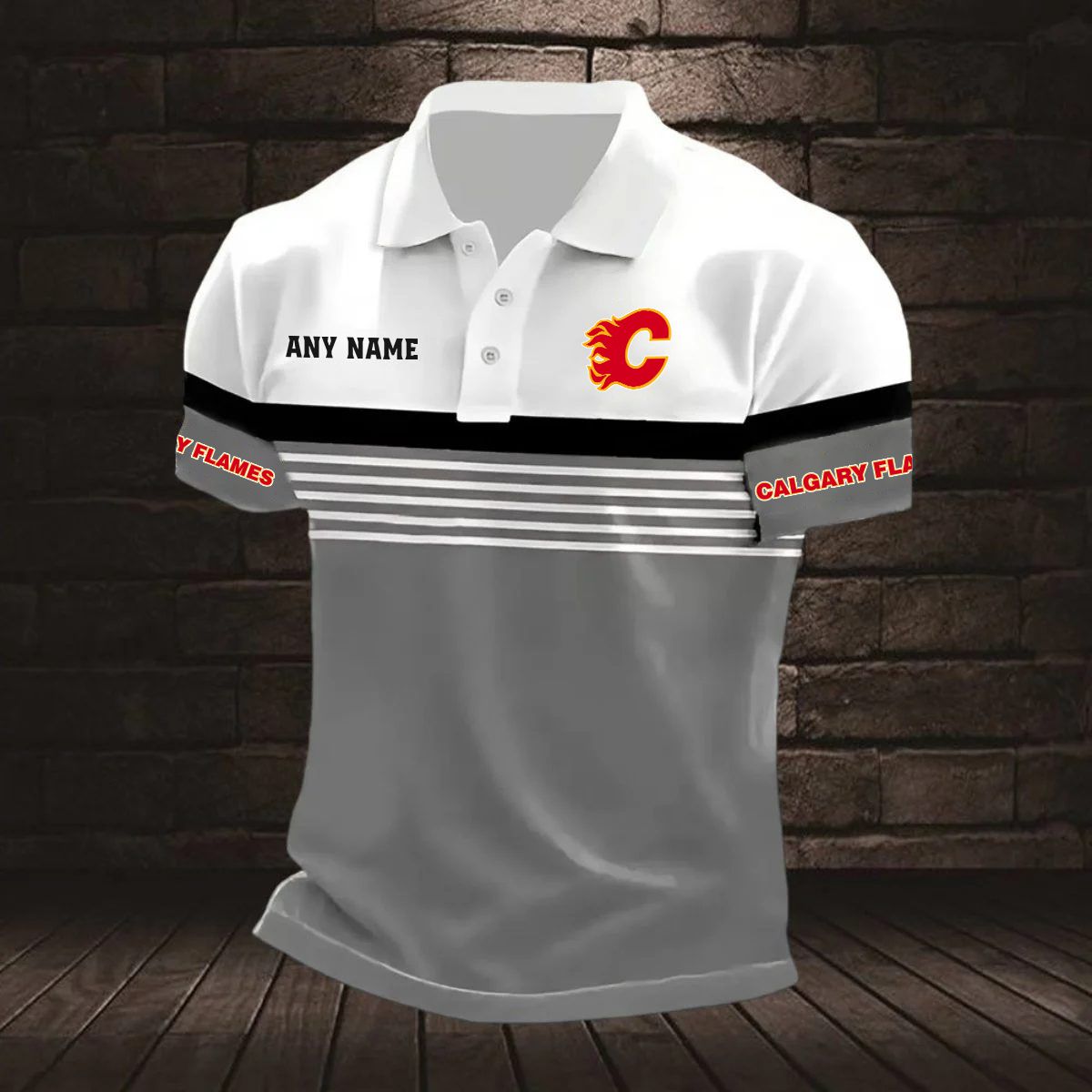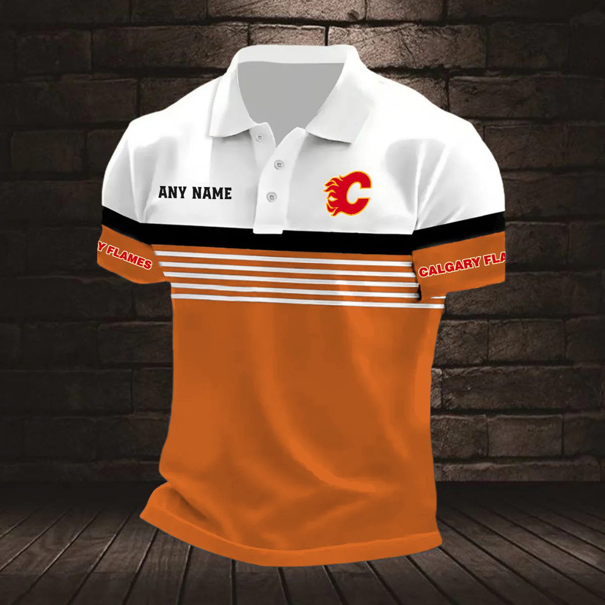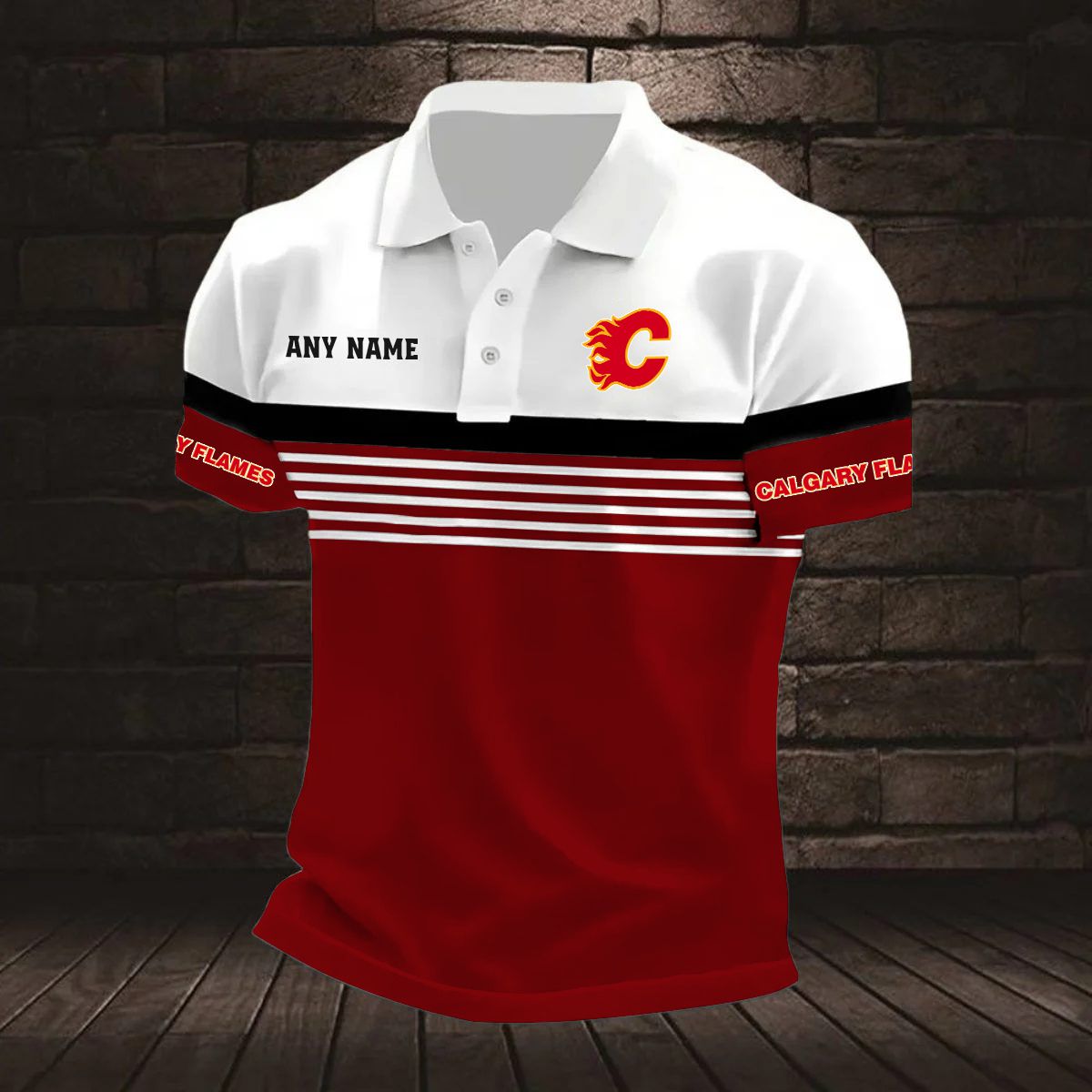 NHL Calgary Flames Personalized Name Stripped Multi Color Polo Design ST2501